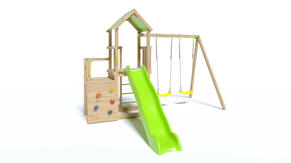 + Aire de jeux "tout en un" grâce aux balançoires, bac à sable, mur de grimpe et toboggan