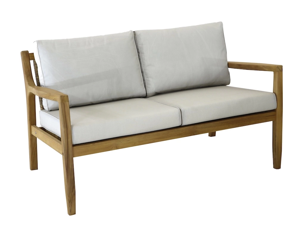 OFFERTLe canapé lounge HAUBAN en teck FSC 100% avec coussins crème est l'élément parfait pour un espace de détente élégant et confortable. Idéal pour les moments de relaxation, il combine la robustesse du teck et le confort des coussins en polyester. Ce canapé 2 places apporte une touche naturelle et sophistiquée à votre salon ou terrasse.