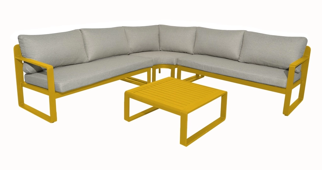 OFFERTLe set MOJITO II combine style et confort avec un canapé d'angle et une table basse. Ce set, composé de 2 méridiennes, 1 angle et 1 table basse, offre un espace de détente idéal pour 6 à 7 personnes. Conçu avec un châssis en aluminium époxy et des coussins en polyester déhoussables, ce set est facile à monter et apporte une touche moderne à votre salon. La table basse est équipée d'un plateau à lattes pour ajouter une dimension élégante à l'ensemble.