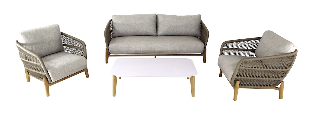 OFFERTLe set BARBARA est conçu pour offrir confort et style à votre salon. Ce set composé de 1 canapé, 2 fauteuils et 1 table basse allie un châssis en aluminium époxy et un tissu Rope/Heat élégant. Facile à assembler, il offre un espace de détente moderne et pratique pour 4 à 5 personnes, parfait pour les moments conviviaux.