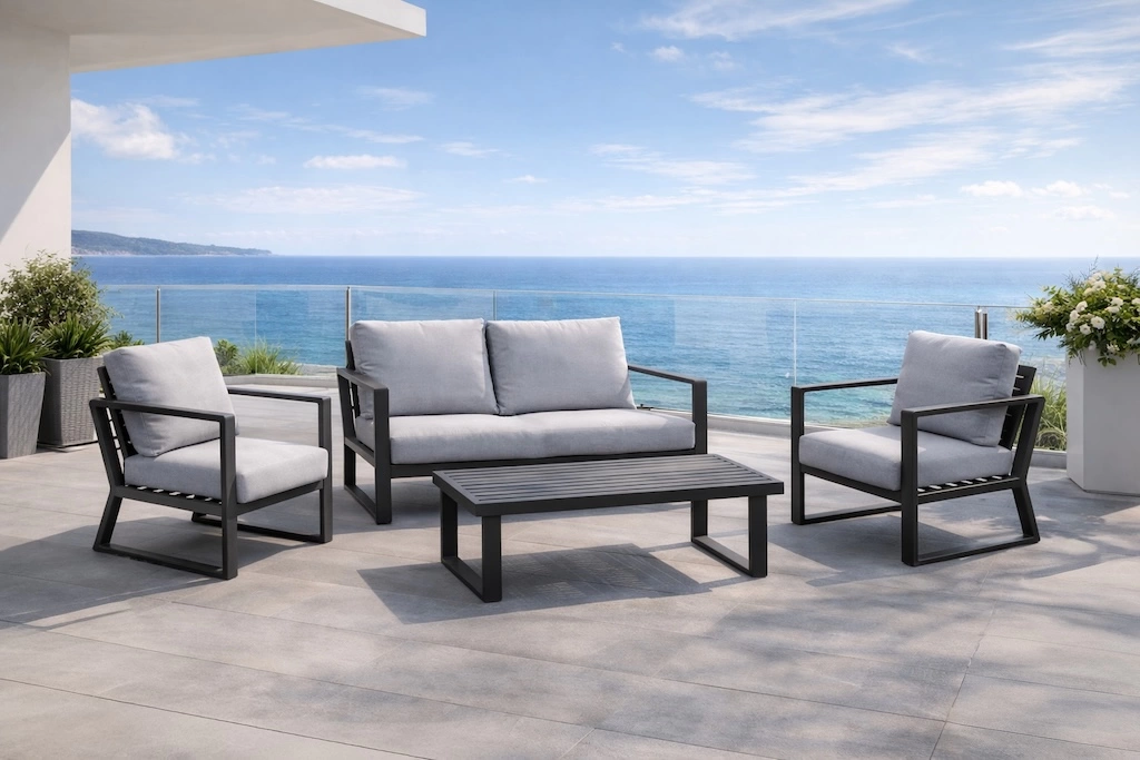 Salon de détente Lava aluminium coussins Sunbrella – canapé 3 places, 2 fauteuils et table basse – graphite