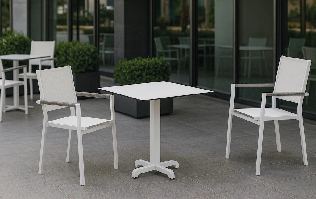 La table LANZAROTE 80 x 80 cm est dotée d’un plateau en HPL, reconnu pour sa grande résistance aux UV, aux rayures et aux intempéries. Sa structure en aluminium assure légèreté, stabilité et durabilité, idéale pour un usage extérieur régulier.