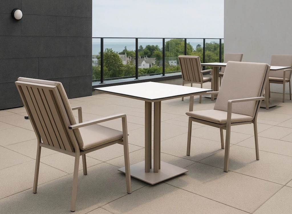 La table carrée CANVAS 80 x 80 cm dispose d’un plateau en HPL blanc, reconnu pour sa grande résistance aux UV, à l’humidité et aux variations climatiques. Sa structure en aluminium garantit une excellente stabilité tout en restant légère et facile à déplacer au quotidien.