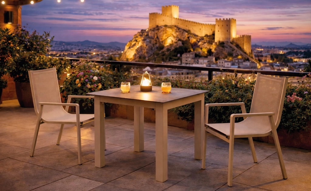 Les fauteuils SIDNEY-3 complètent harmonieusement l’ensemble grâce à leur assise en textilène coloris topo, confortable, respirante et facile à entretenir. Leur structure en aluminium garantit robustesse et longévité. Fabriqué entièrement en Espagne, cet ensemble bénéficie d’un haut niveau de qualité et de finitions soignées.
