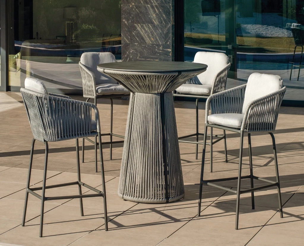 La table de bar RODHOS Ø90 cm dispose d’un plateau en HPL PIZARRA, reconnu pour sa grande résistance aux intempéries, aux rayures et aux UV. Sa structure tout aluminium assure stabilité, légèreté et longévité, tout en s’adaptant parfaitement à un usage extérieur intensif.