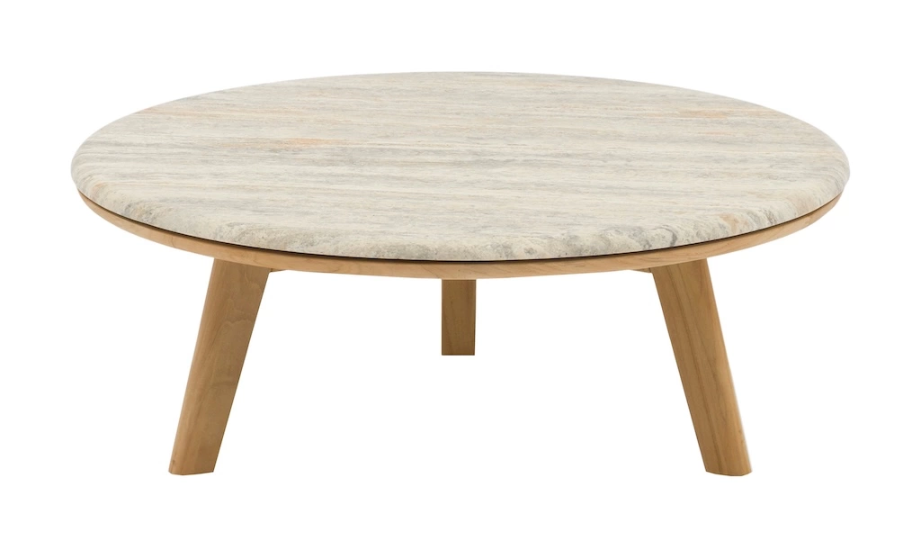 Sa structure robuste en teck massif assure une excellente durabilité en extérieur, tandis que le plateau en pierre naturelle apporte caractère et sophistication. Le contraste entre le bois chaleureux et le travertin minéral sublime vos espaces détente.