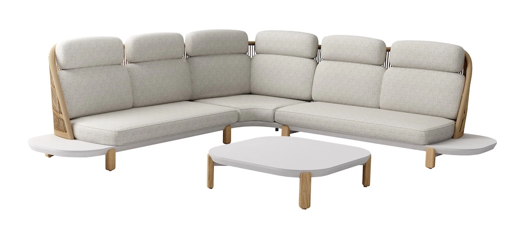 Salon d’angle de jardin Moss II aluminium coussins Sunbrella – méridiennes - module angle et table basse – blanc
